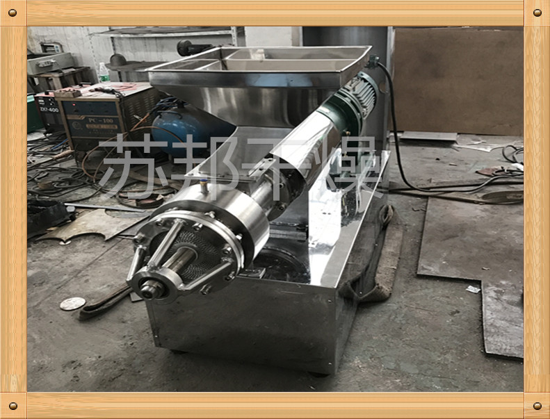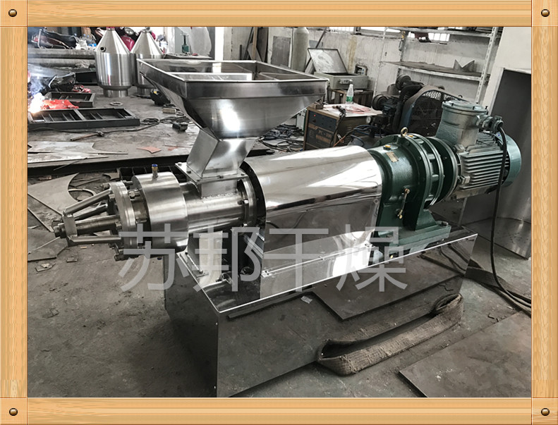 通過變頻器調(diào)速和蝸輪蝸桿減速、使螺桿旋轉(zhuǎn)推料達(dá)到擠壓作用,使物料向網(wǎng)板強(qiáng)制壓出,從而得到所需顆粒,料筒外表有水循環(huán)系統(tǒng)、對物料能冷卻作用。