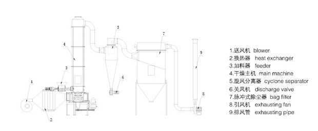 熱空氣由入口管以適宜的噴動(dòng)速度從干燥機(jī)底部進(jìn)入攪拌粉碎干燥室,對(duì)物料產(chǎn)生強(qiáng)烈的剪切、吹浮、旋轉(zhuǎn)作用,于是物料受到離心、剪切、碰撞、摩擦而被微粒化,強(qiáng)化了傳質(zhì)傳熱。在干燥機(jī)底部,較大較濕的顆粒團(tuán)在攪拌器的作用下被機(jī)械破碎,濕含量較低、顆粒度較小的顆粒被旋轉(zhuǎn)氣流夾帶上升,在上升過(guò)程中進(jìn)一步干燥。由于氣固兩相作旋轉(zhuǎn)流動(dòng),固相慣性大于氣相,固氣兩相間的相對(duì)速度較大,強(qiáng)化兩相間的傳質(zhì)傳熱,所以該機(jī)生產(chǎn)強(qiáng)度高。