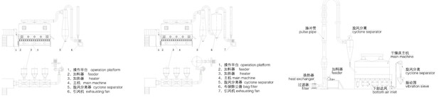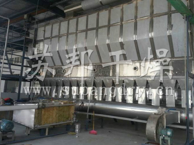 潔凈的熱風(fēng)經(jīng)閥板分配進(jìn)入床體內(nèi),從加料器進(jìn)入的濕物料被熱風(fēng)形成沸騰狀態(tài)。由于熱風(fēng)與物料廣泛接觸,增強(qiáng)了傳熱傳質(zhì)的過程,因此在較短時間內(nèi)就可干燥。從床體的一端進(jìn)入,經(jīng)過幾十秒至幾分鐘的沸騰干燥,自動從床體另一端流出。本設(shè)備一般進(jìn)行負(fù)壓操作。